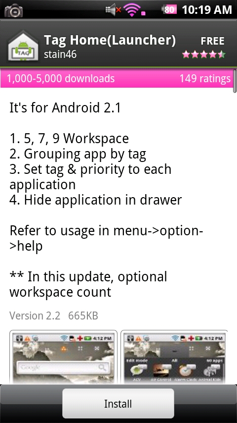 Tag Home: (free) A nice home replacement app for 2.1 users only. Whilte not quite as clean as Helix or LauncherPro, this does off a feature I’d like to see in other home replacements and that is the ability to tag apps.