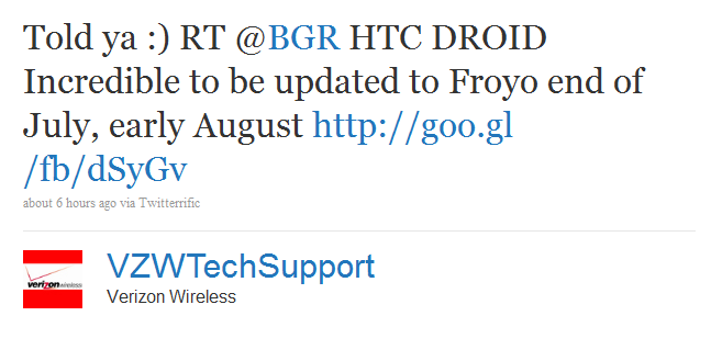 An unofficial Verizon Tech Support Twitter account basically confirmed today that the delay of the OTA update for the Droid Incredible is because Android 2.2 will now be included. Yes, “unofficial,” meaning they admitted to being official tech reps, just not ones endorsed by corporate VZW. Even so, we’re guessing they still have a pretty good inside track as to update statuses.