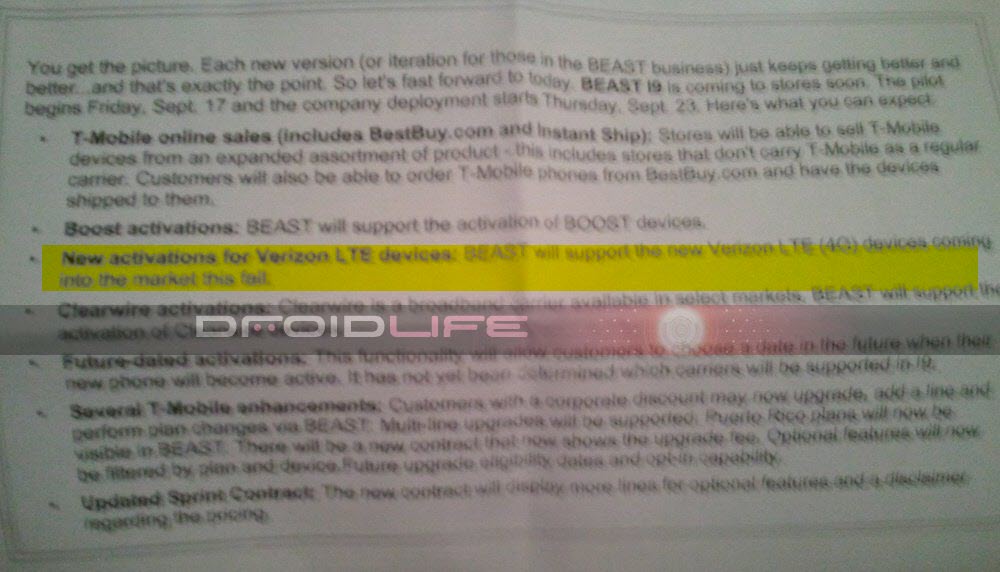 It looks like Best Buy has been handed some information regarding the release of LTE (4G) devices from Verizon. In fact, they fully expect some to be available “this fall” and have already updated BEAST, their internal activation system, to accommodate these mysterious LTE phones. While no specific devices are listed, this is one of the first times we’ve actually heard “devices” mentioned rather than the service which Verizon has said is coming to 30 NFL cities by the end of the year.