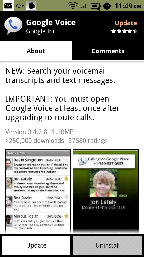 Google Voice just received a much needed update that allows you to search through your voicemail transcripts and text messages. As you can see from the shot above, you can now easily see how many times your writers spam your inbox…err. (Hi Tato!) As you would also expect from a search giant, this new feature works very well and a button for it has now replaced the “Settings” option you once received when hitting menu.