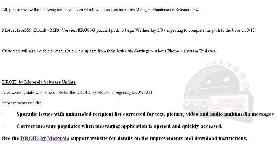 Nope, it’s not Gingerbread. If you want to get anywhere close to Android 2.3 on your original DROID, then check out this or this. For those of you still running stock software though, an update will start rolling out today that will bring you up to FRG83G and to Android 2.2.2. This is the 3.4MB update that Motorola was testing back in January and now looks to be ready.