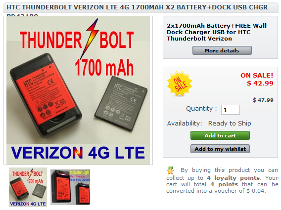 Bringing up the battery life on the HTC Thunderbolt is like fingers scraping across a chalkboard, but I still wanted to point out that a 1700mAh battery is now available for it. Up until now, you’ve had Seidio’s overpriced 1600mAh version or the ugliest battery on the face of the Earth aka the 2750mAh from HTC. So while this isn’t a huge jump, it is an option that some of you 4G hogs may want to consider. As of right now, it only looks like it’s available on eBay or HTC Express which I’ve linked below.