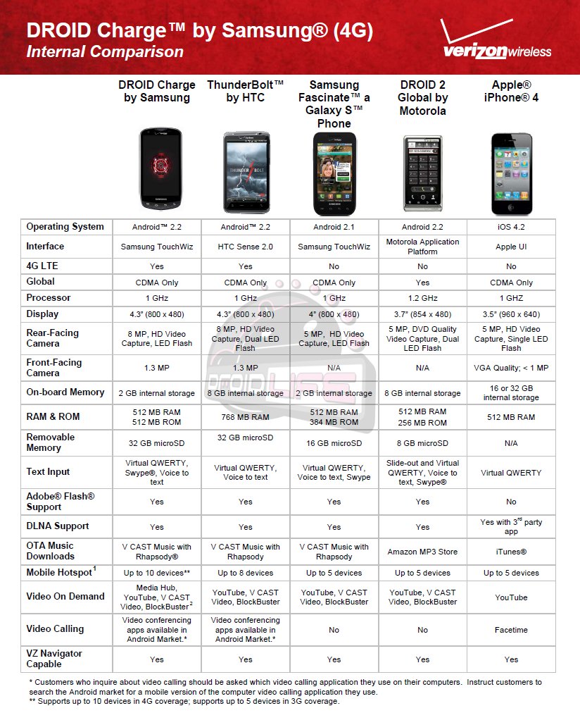 We broke news earlier on the DROID Charge having the ability to connect up to 10 devices through its mobile hotspot app, but we’re back with more. Been wondering how the device compares to the competition both inside and outside of Verizon? Above we have the battle between it and the Inspire 4G, Atrix 4G, myTouch 4G and EVO 4G. And below, we have the Charge compared to other Big Red devices like the Thunderbolt, Fascinate, DROID 2 Global and i*hone 4.