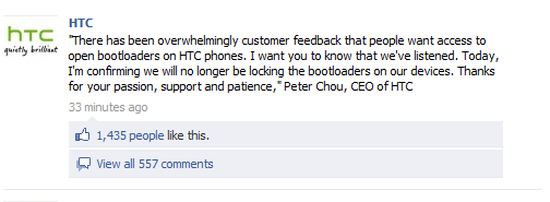 We have done it! HTC’s CEO, Peter Chou has confirmed in a quote from the HTC facebook page that they will no longer be locking the bootloaders on their devices. This could be the first step to other companies following suit. We can only hope. Here’s the quote from Mr. Chou.