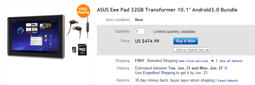 It’s looking like today is the day of tablets around here. We have Galaxy’s tomorrow, XOOMs at Costco, and now we have Asus Transformers. The plus on this deal is that it’s coming with a sweet little bundle of goodies. Packaged with it are a set of Klipsch ProMedia in-ear headphones, a Centon 8GB MicroSDHC card, and wait for it…free shipping. All this for $475. Does that excite you all?