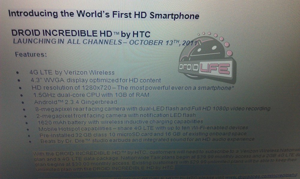 So the picture above just popped into our inbox. Not really sure what to think about, but definitely wanted to share. According to this document (which could be 100% fake), the HTC Vigor will be branded as the DROID Incredible HD and then released on October 13 as the “world’s first HD smartphone.” Do we believe it? Not sure just yet. The number one issue I have is that this spec sheet lists the phone as having a 4.3″ WVGA (800×480) display that is “optimized for HD content” yet mentions the resolution as being 1280×720 and “HD” right below it. So what is it? Could be an error by a Verizon employee or could just mean the entire thing is fake.