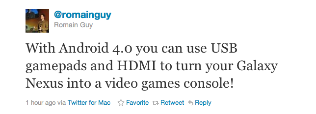 Romain Guy, an Android engineer, sent out an interesting tweet this afternoon. According to Mr. Guy, Ice Cream Sandwich will let users use USB gamepads to enhance your mobile gaming experience. While some of you may just see this as another accessory you will have to spend money on, this is pretty exciting news for any gamer.
