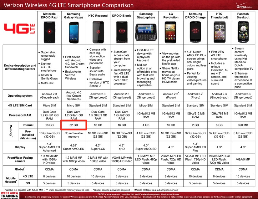 When the Samsung Galaxy Nexus was introduced, we were told that the device would come in both 16GB and 32GB models with no SD card slot in sight. The lack of removable storage worried many of you, so when we saw minimum advertised pricing lists showing the phone at $299 on multiple occasions, we kept wondering which version this would be. According to a training document that compares the device to the DROID RAZR and HTC Rezound, it appears as if Big Red is getting the big 32GB model. Hallelujah! While that may not solve the fact that it doesn’t have removable storage, it should at least give you piece of mind that it will take you some time to actually fill up that much space. Simply popping your current card out of your current phone and dropping it into the G-Nex though, not happening.