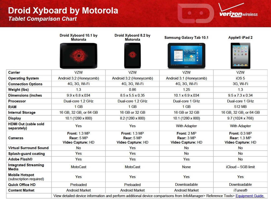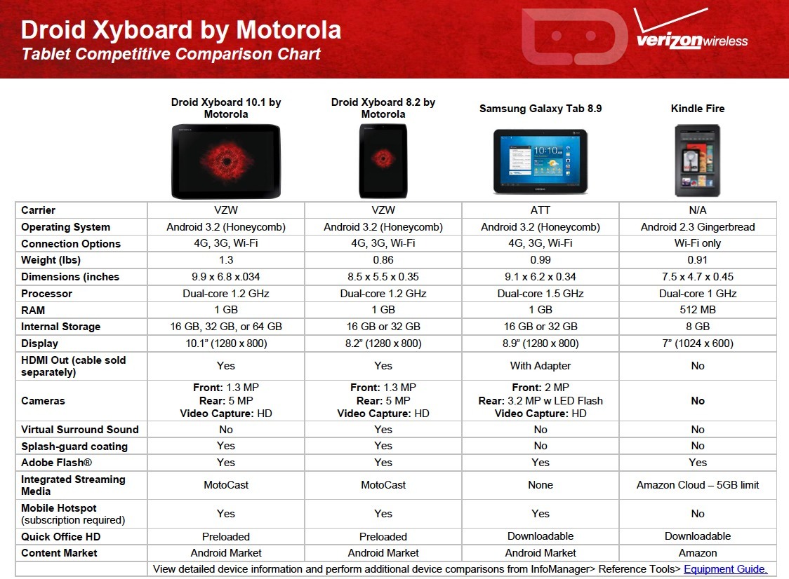 Intrigued by the DROID XYBOARD tablets that Verizon announced yesterday? Then you may want to take a look at these two comparison charts that pit both against the competition, including the iPad 2 and the Kindle Fire.