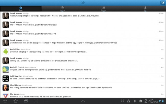 I use Twitter all the time, so having a great Twitter app is important to me. I’ve tried all the apps out there and the official Twitter app remains my favorite (mostly because TweetDeck has become abandonware). Unfortunately, the Twitter team hasn’t taken the time to make the Twitter app optimized for tablets, which leads to the hideous layout above. It’s usable (though very laggy), but I’ve been forced to switch between Tweetcaster, Plume, and Tweetcomb, all of which have issues. Perhaps the most maddening part of the situation is not that there are only three tablet optimized Twitter apps, but that Twitter has a tablet optimized version of their app for iOS.