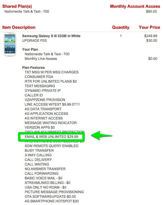 We have heard from readers that spoke with VZW support reps who are for some reason under the impression that this isn’t the case. I hate to say this, but I’m not sure they know what they are talking about. The only way Verizon could get me off of unlimited data after going through this pre-order, would be to void my contract and force me onto a shared plan. They can’t do things like that, folks. Even if the phone ships on July 9 (after shared plans are live), I have already locked in according to the document that you are seeing below. When I activate the device whenever it does ship, it won’t matter because it’s all about the date that you sign the new contract, which for me, was last week or for you would be this week.