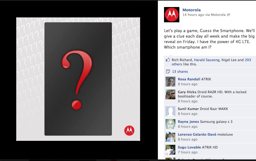 I guess you could also take this new “game” as something to get people to interact on Moto’s Facebook page, rather than them actually announcing a new phone. As in, they could give off clues for 5 days to a phone that has already been released (RAZR, RAZR MAXX, Photon Q, or Atrix HD), hoping that you stick around for 5 days to comment and “like” things on their page. We could get to Friday and the “big reveal” could be, “Great job, you guessed the Photon Q!”