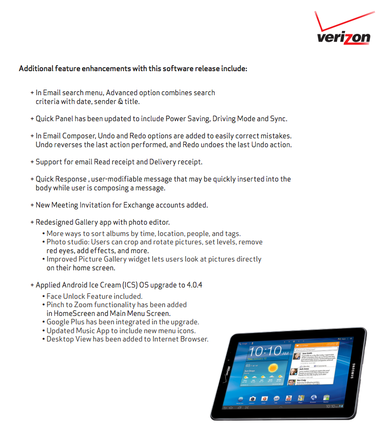 Samsung and Verizon can check the Galaxy Tab 7.7 off of their Ice Cream Sandwich update list, as the build of LP10 was approved this morning with changelogs posted. The update brings the tablet up to Android 4.0.4, still includes Samsung’s TouchWiz UI, a data usage meter, new calculator, new homescreen layout, more organized settings, a redesigned gallery app with photo editor, Face Unlock, new music app, desktop view in browser, and more.