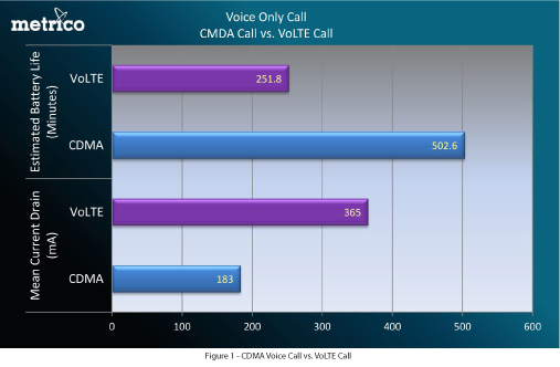 During the test, the device lasted 252 minutes over VoLTE and 503 minutes on CDMA. It’s tough to say why the drain happened so quickly, but the author of this study tossed out the idea that when using VoLTE only, you are only using the LTE chip, which could result in a larger drain. I don’t know that I necessarily buy into that idea, since we spent the first year of LTE complaining about dual-radios and the fact that a device’s battery was horrible because it had to power both an LTE and CDMA radio simultaneously.