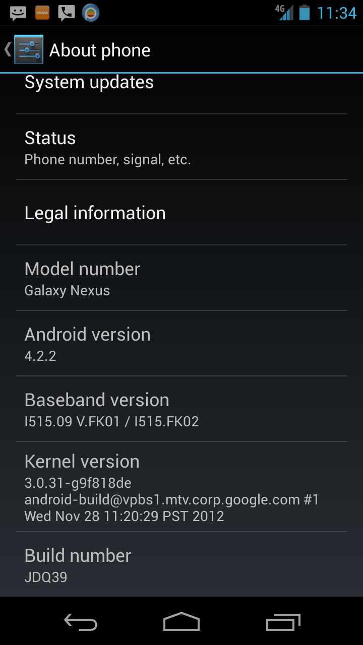 If you have followed along in the journey of the VZW G-Nex, then there is a better than average chance that you have grabbed an early test build for the device from El Madhatter, a long standing member of XDA. Well, we reached out to him this morning to check in on his device, and sure enough, he claims to have received 4.2.2 (JDQ39) this week. He also sent along the screenshot above. Unfortunately for our greedy update-needing purposes, he has already applied the update, is no longer rooted, and doesn’t have access to a computer. So any chance of us retrieving this update, are slim for the moment.