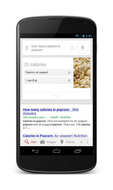 This morning, Google announced that they will now display nutritional information from the Knowledge Graph in Google Search. Once live, you should find “extensive nutrition information for over 1,000 fruits, vegetables, meats and meals in search,” from both the web and your mobile device. As you can see in the images included in this post, you should be able to ask your device specific nutrition questions and have it respond back to you. When you ask Google “how many carbs are in corn?” it should respond while also providing a card with quick information, much like you see with other Google voice searches.