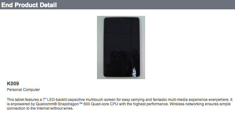 Update: Reader Tyler points out that a similar Asus tablet under the model number K009 stopped off at Bluetooth SIG recently, and even presented itself via blurry-cam photo. The device definitely looks like a Nexus 7. The description even mentions that the tablet features a 7″ LED-backlist capacitive multitouch screen. Where it gets confusing, is the mention of a Snapdragon 600 processor instead of the Snapdragon S4 Pro listed at the FCC. I think I’m going with the FCC filing on this one.