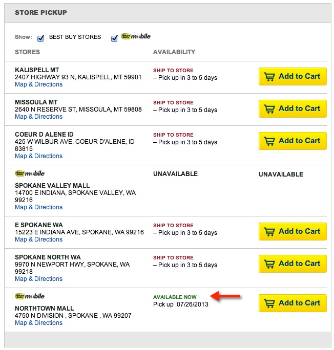 Store pick-ups also are popping up as an option through select Best Buy stores. In fact, our inbox was flooded with emails from readers who had their pre-order statuses updated to “pickup in-store today.” As you can see in the image below, most stores around me are showing “ship to store in 3 to 5 days,” however, at least one store out of Spokane is listing the device as available for pick-up immediately.