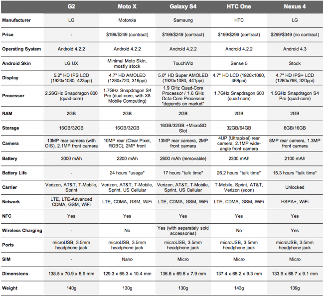 With the LG G2 now official, and a spec list in our inbox, it’s time to do our standard comparison to its competitors. Since the G2 is the first on the planet to use Qualcomm’s new Snapdragon 800, a brand new IPS display tech, and Optical Image Stabilization in its 13MP camera, it’s easily going to show its advantages over the Galaxy S4, HTC One, Moto X, and Nexus 4, at least on paper. But, we still wanted to get it all out there for you.