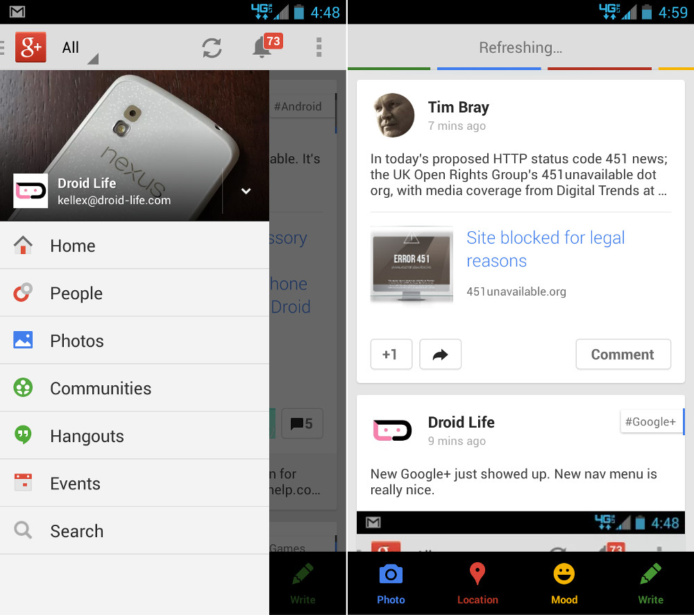 The sizable version 4.1 update for Google+ on Android that was teased earlier in the week is now rolling out to the masses. To recap, this update makes profile switching much easier, introduces Google Drive photo management, pull-to-refresh in the stream and notifications, improves location settings, and officially swaps out Messenger with Hangouts. It’s a good one, trust me.
