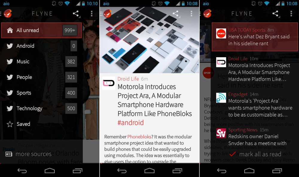 Navigating around Flyne is quite similar to Falcon Pro. A swipe from the left gets you into a navigation menu that lists out your categories and how many unread items you have. A swipe from the right gets you a list of articles from a selected category that you can scroll through. You can mark all as read or jump into a particular story from there. Once on an article, you can swipe left or right to get to the next article, tap on links to enter the browser, save favorites for later, or share with friends.
