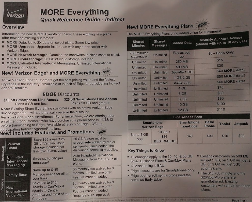 According to multiple sources of ours, tomorrow morning, Verizon will unleash its response to the recent changes made by both T-Mobile and AT&T. Big Red is going to announce new “MORE Everything” plans that aim to give customers more data at no extra cost, doubled bandwidth, free 25GB of cloud storage, and unlimited international messaging. If you are a part of Verizon’s EDGE upgrade program, you will see extra discounts on your line access as well, which could vary depending on the amount of data you are signed up for.
