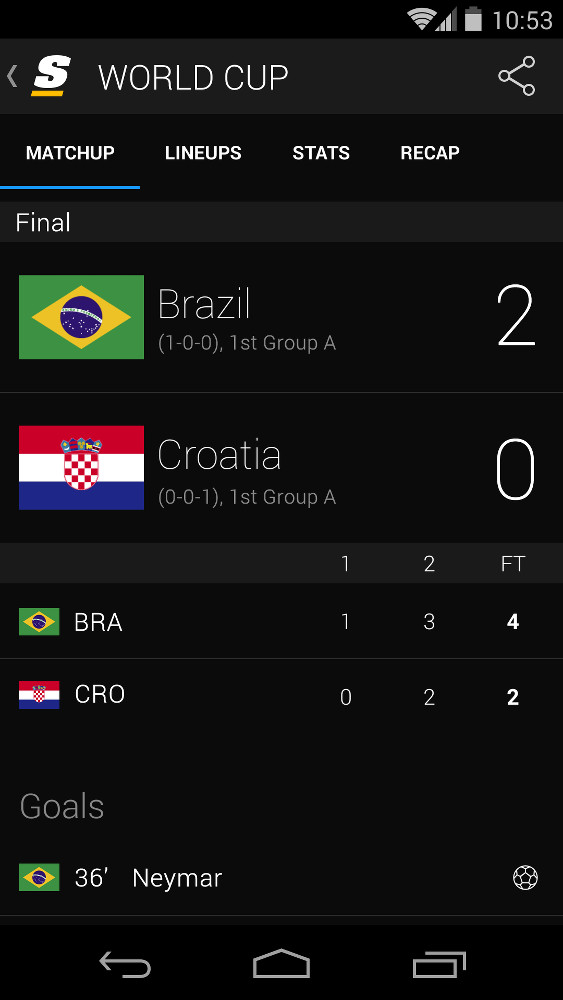 - Bracket View: Fans can track their favorite team’s route to the final in Brazil thanks to our fully interactive World Cup bracket view.