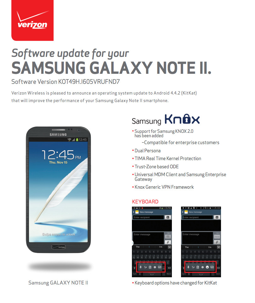 If the enterprise side of the update means nothing to you, then know that you are also getting a brand new keyboard, along with other Kit Kat goodies. Verizon’s changelog doesn’t get deep into the details, but you should see a revamped lock screen with enhanced media controls, the option to choose a default SMS app, restyled notification bar, wireless printing, and more.