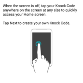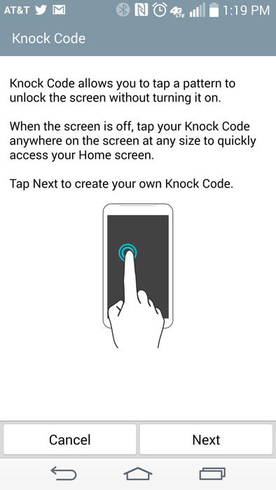 - Knock Code – Similar to KnockOn, LG took its screen tapping feature to a secure level with Knock Code. Knock Code allows a user to program a series of screen taps in quadrants on the display that will unlock it similarly to a PIN or password. The pattern can be tapped without the screen even on, so again, you can get things done on your phone without ever touching a button.