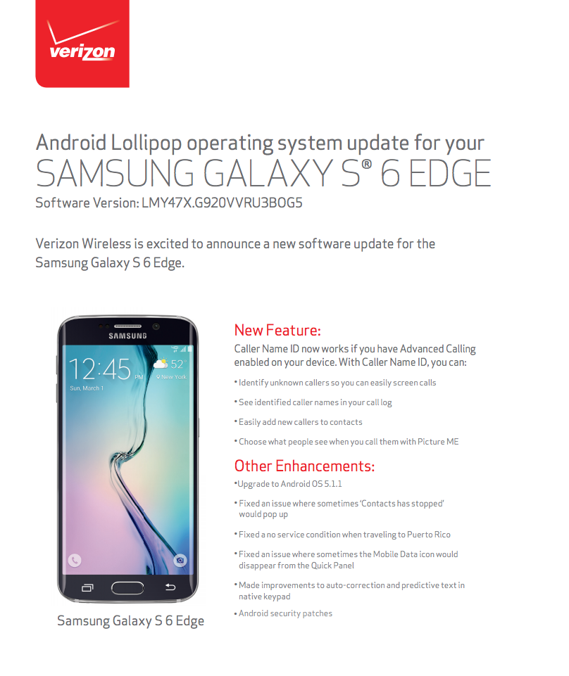 The Galaxy S6 and S6 Edge are looking at builds of G920VVRU3BOG5 and G925VVRU3BOG5, respectively. Verizon posted the changelogs for them today, so I would imagine that the updates will begin rolling out tonight or tomorrow.