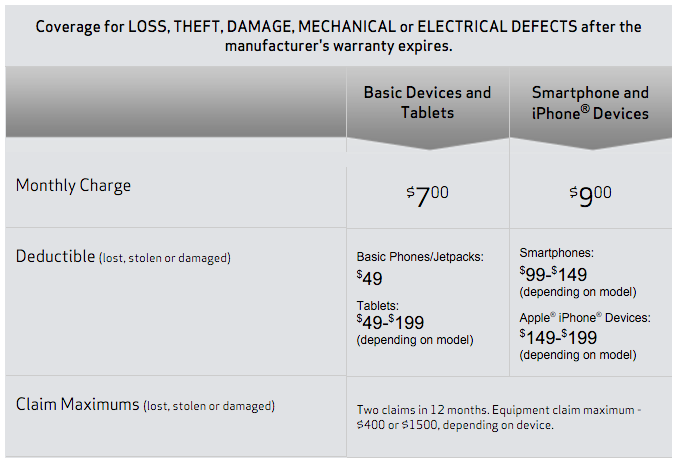 - Total Equipment Coverage ($9.00 per month for smartphones; $7.00 per month for tablets): Protect your device against loss, theft, accidental damage and defects after the manufacturer’s warranty expires (combines Verizon Wireless’ Extended Warranty with Asurion’s Wireless Phone Protection).