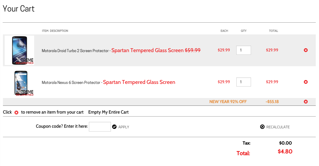 Take a look at my screenshot below to see the kinds of savings we’re talking about. I added two $30 Spartan Tempered Glass Screen protectors, and should I buy them, will only pay $4.80.