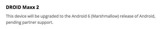 Oh, and get this. The DROID MAXX 2’s Marshmallow status page on Motorola’s site only says that it will receive the update to Android 6.0 “pending partner support.” That doesn’t exactly sound like a promise or guarantee any longer. Look at this.