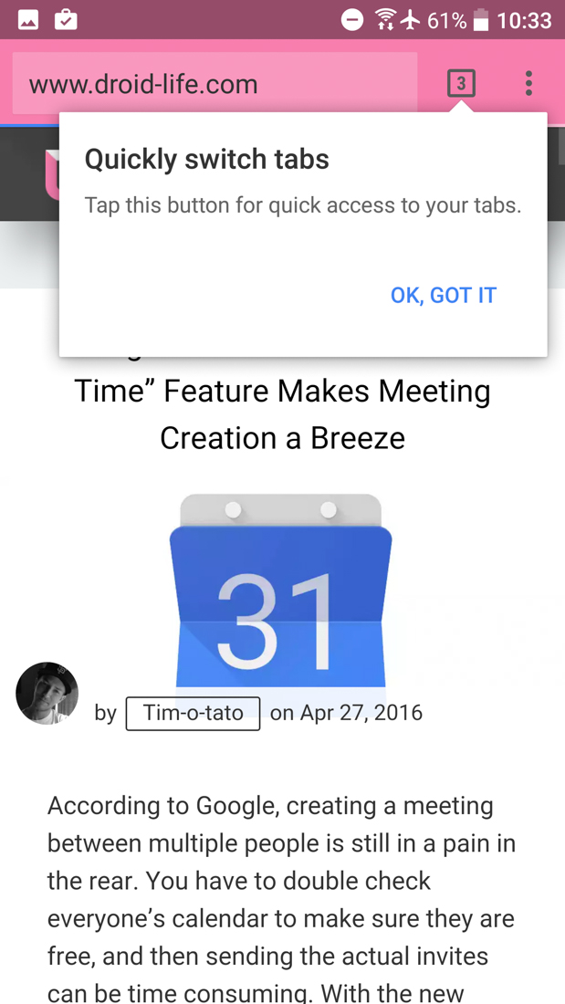 And to show you that merging of the tabs is now 100% gone, here is my HTC 10 before updating to v51. You can see I had it merged with three tabs open, all of which were showing in my app switcher. Then, post update, Google took those tabs out of the app switcher and stuck them back in Chrome, plus it then told me where I could find the tabs because merging is gone. Sad face?