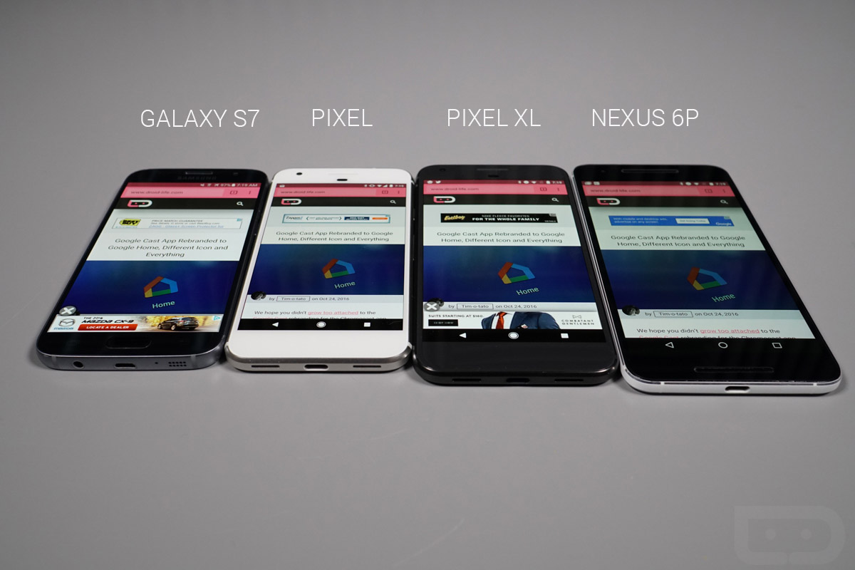 The 5-inch (1080p) and 5.5-inch (1440p) AMOLED panels that Google used in the Pixel and Pixel XL are quite good. As you’ll see in the image comparisons below of each phone to the Galaxy S7 and Nexus 6P, they hold their own in the brightness arena with the S7 and also in color.