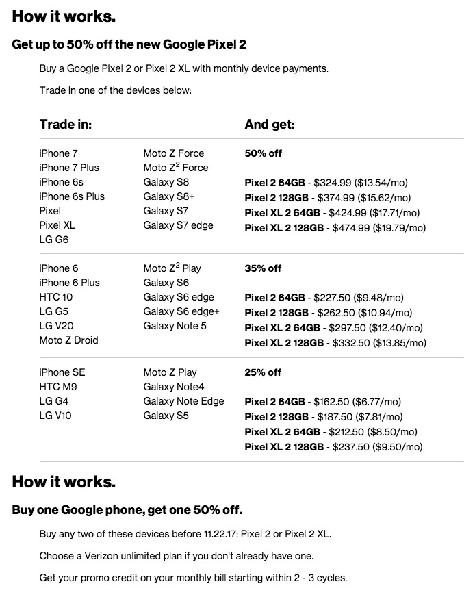 This is the new part of this deal that Verizon just launched. It works similar to the trade-in portion, except you don’t need to trade anything else in for the second phone. What you do is buy the second Pixel 2 or Pixel 2 XL on a device payment plan that’s also on a new line of service, and then Verizon spreads out the 50% off cost over 24 months.