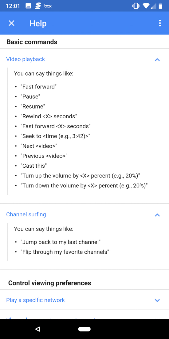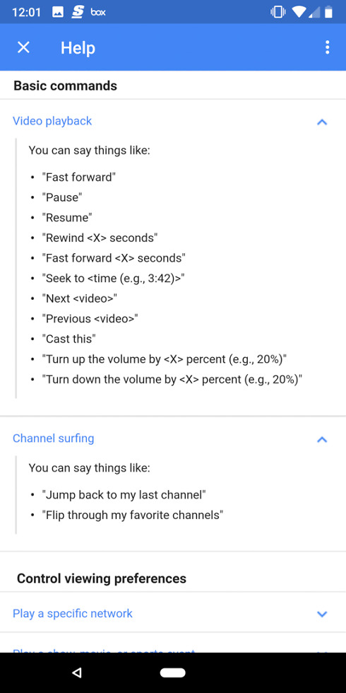 The command list is pretty extensive too, with controls that not only let you search for content, but ones that let pause, fast forward, rewind, and adjust volume. You can even tell YouTube TV to Cast, record a show, watch a specific sports league, or find content based on actors’ names, if they are kid-friendly, etc.