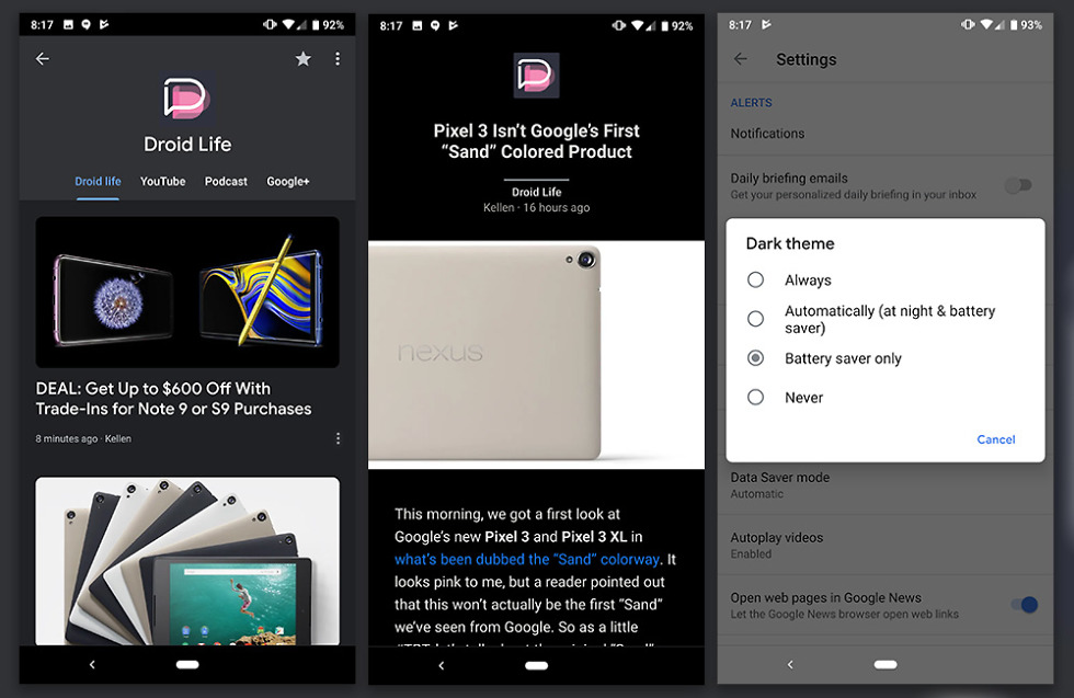 You can see the theme applied above. It does indeed turn everything dark, or in some instances, black. What’s cool here is that Google is giving you some control over when it shows up. You can have it always show, show automatically at nighty or when battery saver turns on, only when battery saver turns on, or leave it off.