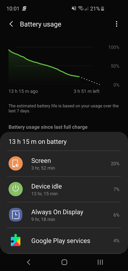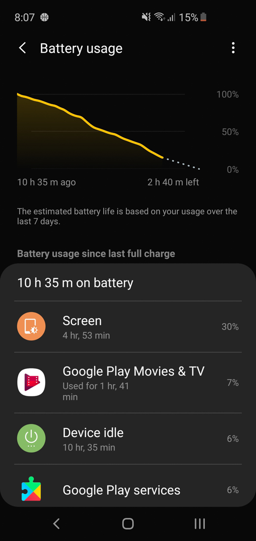 The only real complaint I have with the Galaxy S10e is in the battery life department. It’s just average at best. I initially tested the international model on T-Mobile and battery life was pretty disappointing. I then switched for the past week to the US unlocked unit (still on T-Mobile) and have seem a good amount of improvement. Most days, I’d say I averaged 4 hours of screen on time and had 20% or so left on a charge around 10PM. With those numbers, we’re looking at 15 hours or so off the charger from when I first got up in the morning.