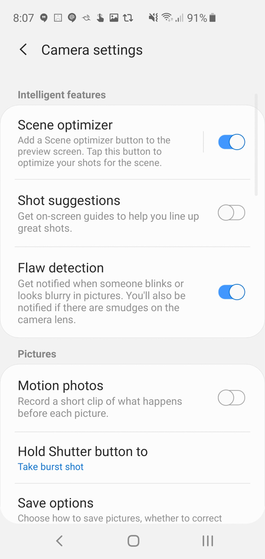 For software, Samsung’s camera experience is a bit bloated, but that just means they included every single modern camera feature you can find in a smartphone. You have auto and Pro modes, Live Focus (portrait) mode, video, super slow-mo, slow motion, panorama, and hyperlapse modes too. There’s even Food and Instagram modes.