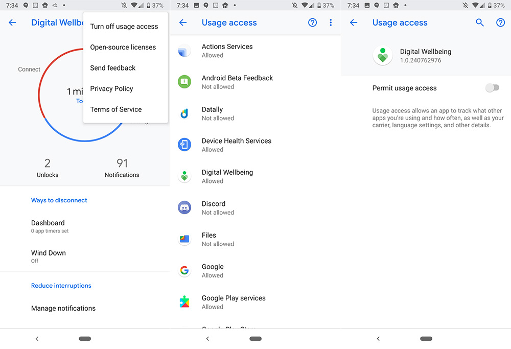 If you want to turn off Digital Wellbeing, open Settings on your Pixel phone, scroll down to Digital Wellbeing, open it, then tap the 3-dot menu in the top right corner. Choose the option to “Turn off usage access.” On the next screen, confirm that you want it off by switching access from “Allowed” to “Not allowed.”