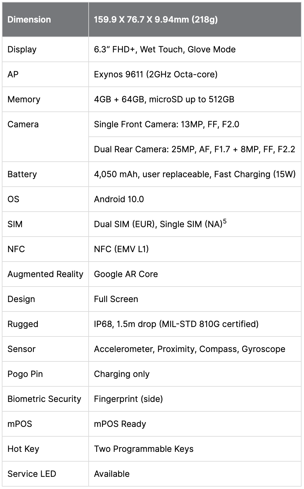 Full specs can viewed below, but the highlights include that aforementioned removable 4,050mAh battery, 6.3″ FHD+ display that has a Wet Touch and Glove Mode for added sensitivity, Exynos processor, 4GB RAM, 64GB storage, dual rear cameras, an IP68 rating, as well as Android 10.