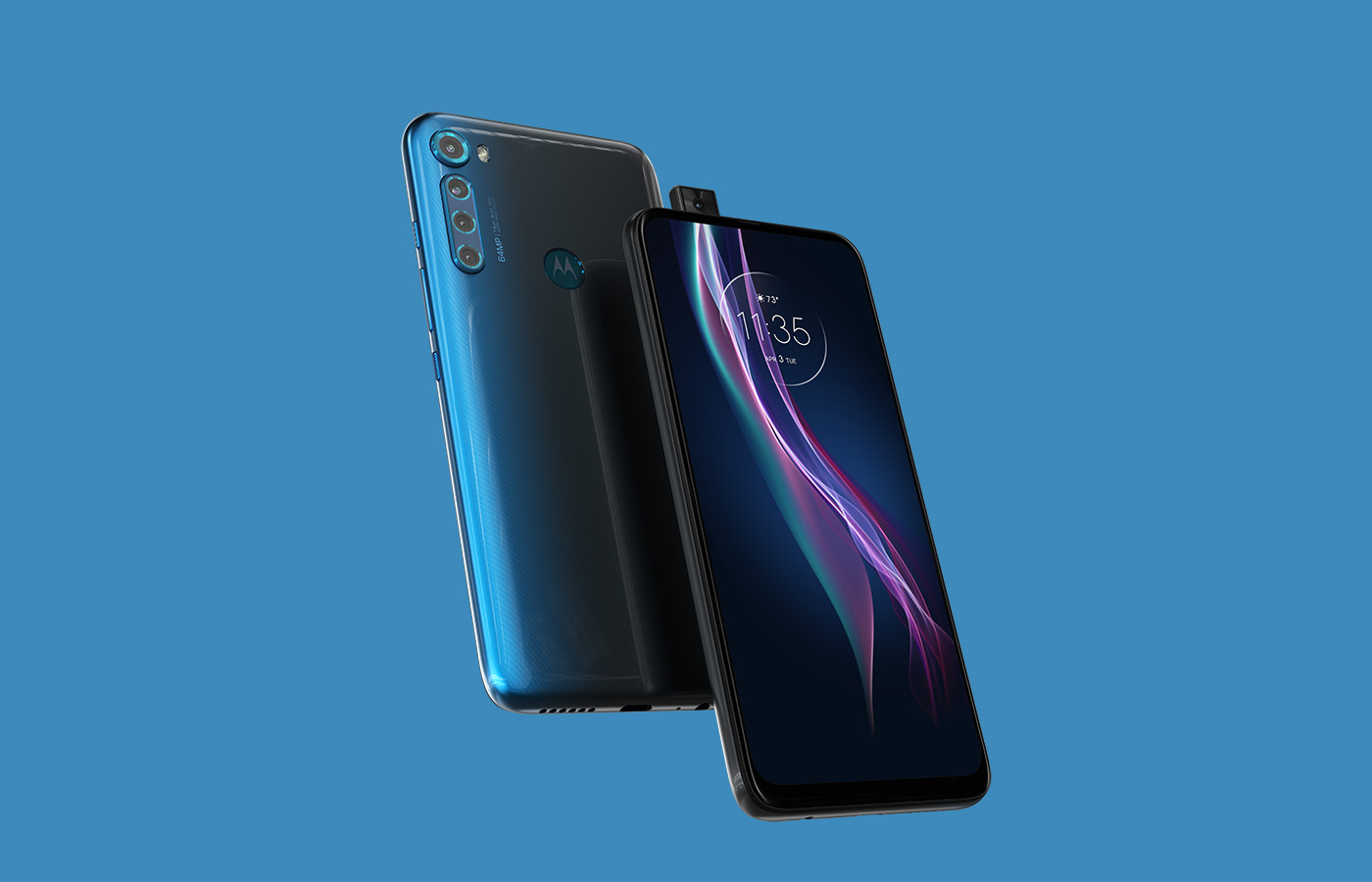 Motorola tossed in a Snapdragon 730 processor, 6.5″ FHD LCD display, 128GB storage with SD support up to 1TB, 4GB RAM, 5000mAh battery (15W charging), quad rear camera with main 64MP shooter, Android 10, and a sweet pop-up 16MP selfie camera. It also has a 3.5mm headphone jack, USB-C port, rear fingerprint reader, and plastic body that can be had in either blue or white. This phone does not have NFC.
