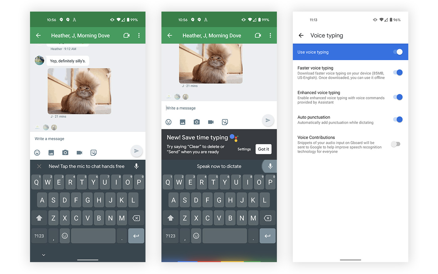 As you can see in the screenshots below, I was prompted with a “New! Tap the mic to chat hands free” message within Gboard that brought a second pop-up with more info. The second pop-up explained that I could now “Save time typing” using the Assistant, where saying “clear” could delete messages and “send” couldĀ send them. The idea, again, is to be able to tap the microphone button in Gboard and then speak more freely.