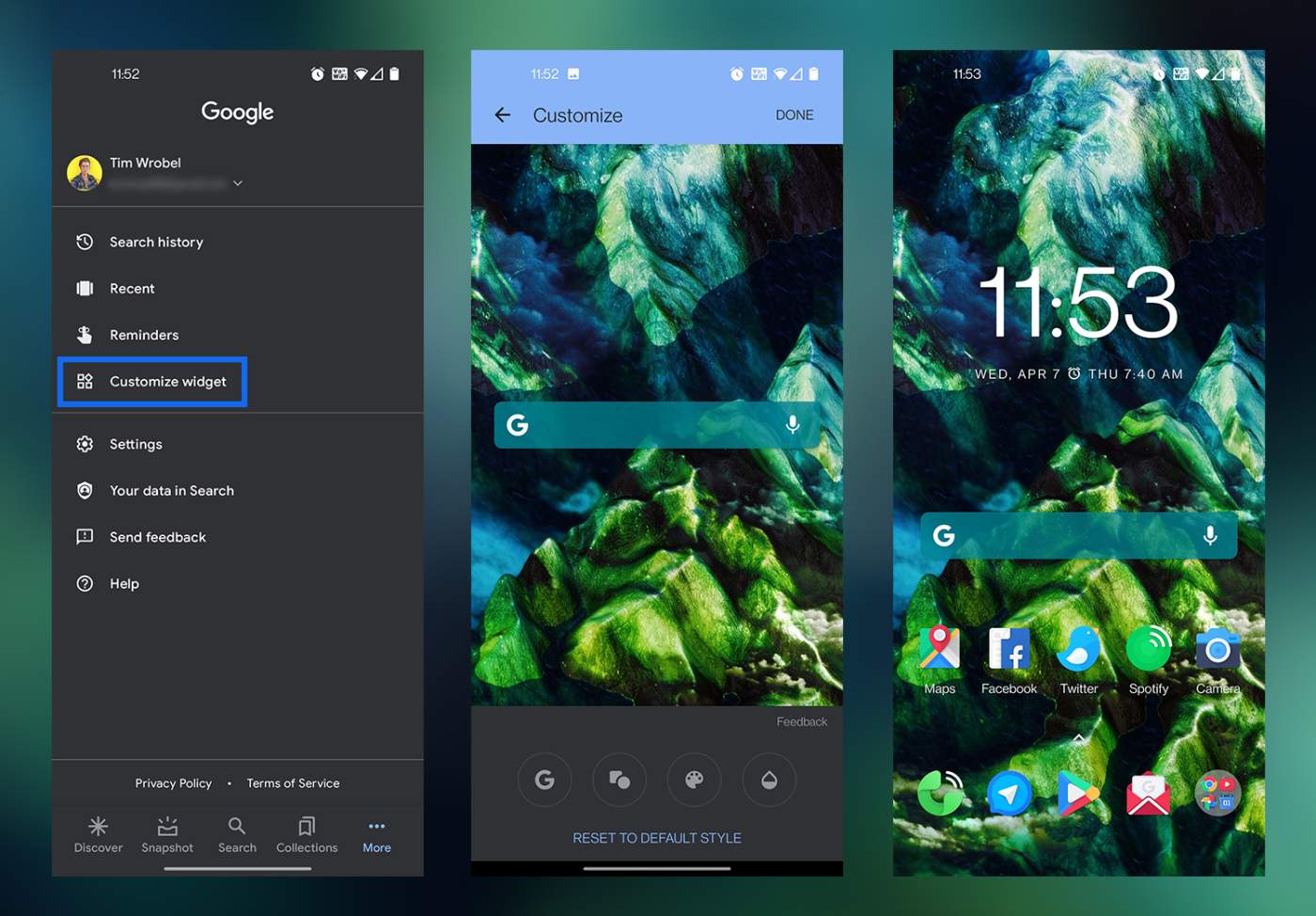 First, make sure you have the Google Search widget added to your home screen. That’s what enables the customization setting inside Google Discover. Once placed where you want it, go inside Google Discover and tap your profile icon in the top right. From here, you’ll see a menu of different settings. Drag your eye down to the middle and you should see a “Customize widget” button. Smack that button. Inside this menu, you can tweak the appearance of the widget. You can change between a “G” logo or full “Google” logo, select the shape of the widget, change the color (there are preselected colors and a custom color option), and you can also customize the opacity of the widget. I have mine set more on the see-through side and I’m feeling it quite a bit.