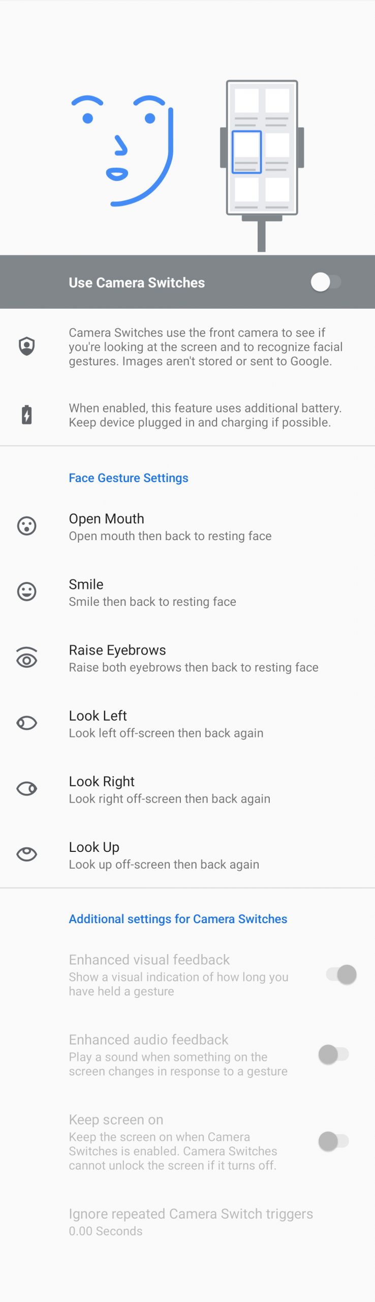 Look at all those settings! As you can see, the gestures include opening your mouth, smiling, raising eyebrows, and looking left, right, or up. All of those facial gestures can be mapped to certain options, from selecting something, gesturing to next or previous, scrolling, or going back home. Depending on how you set each gesture, you could easily move around your phone.