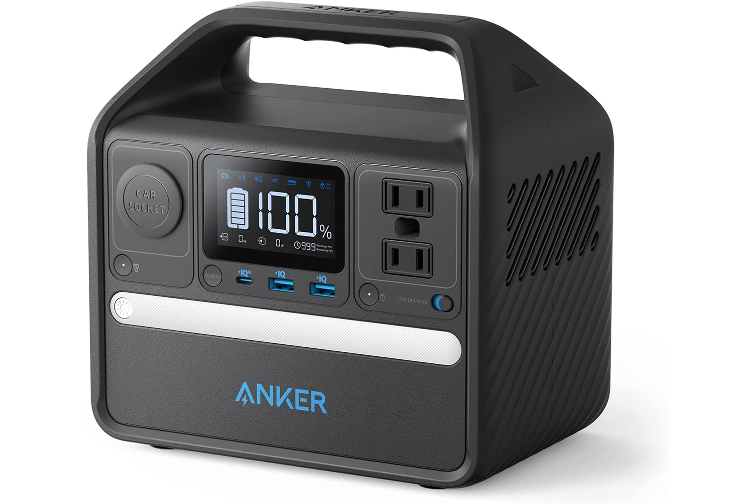 This power station has 256Wh of power with dual power outlets, two USB-A ports, a USB-C port, and a car socket for more power. It can power home appliances, charge your phone dozens of times, your laptop a handful of times, etc. Since it has such a huge battery, it would normally take forever to charge it back up, but Anker allows you to charge it with both an AC outlet and through the USB-C port. That means you can charge it up in around 2.5 hours.