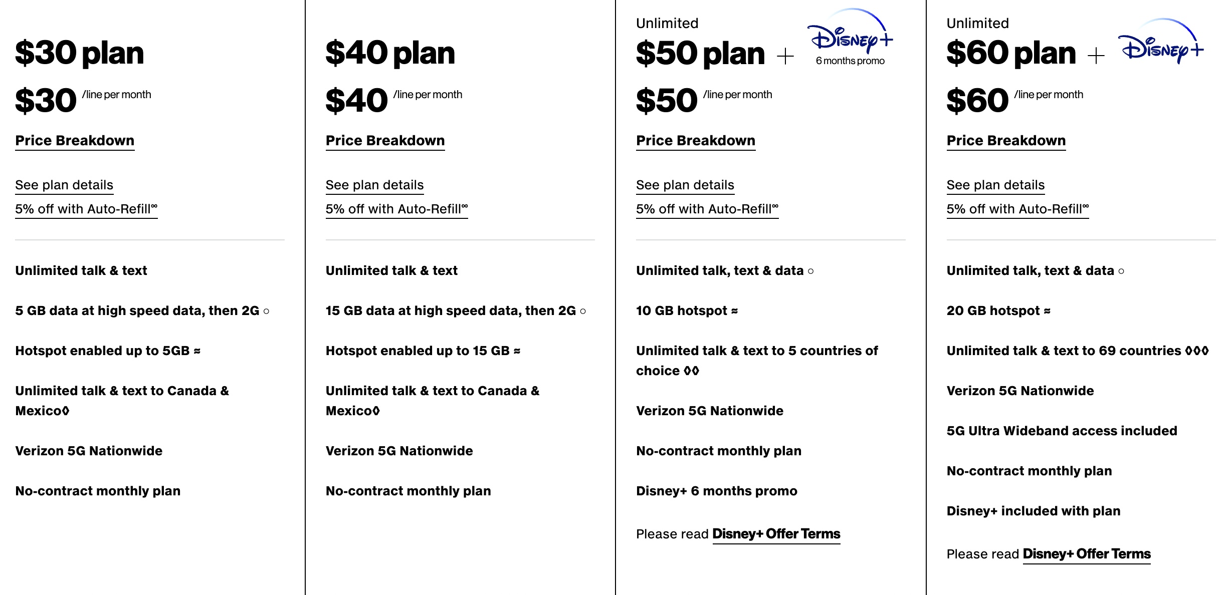 You have a good range of options here. If you don’t use much data, you can get a plan for as little as $30. If you need all the data or that 5G Ultra Wideband access, you can pay for that too. And yeah, there’s Disney+ for free in the top plan to help sweeten the deal.