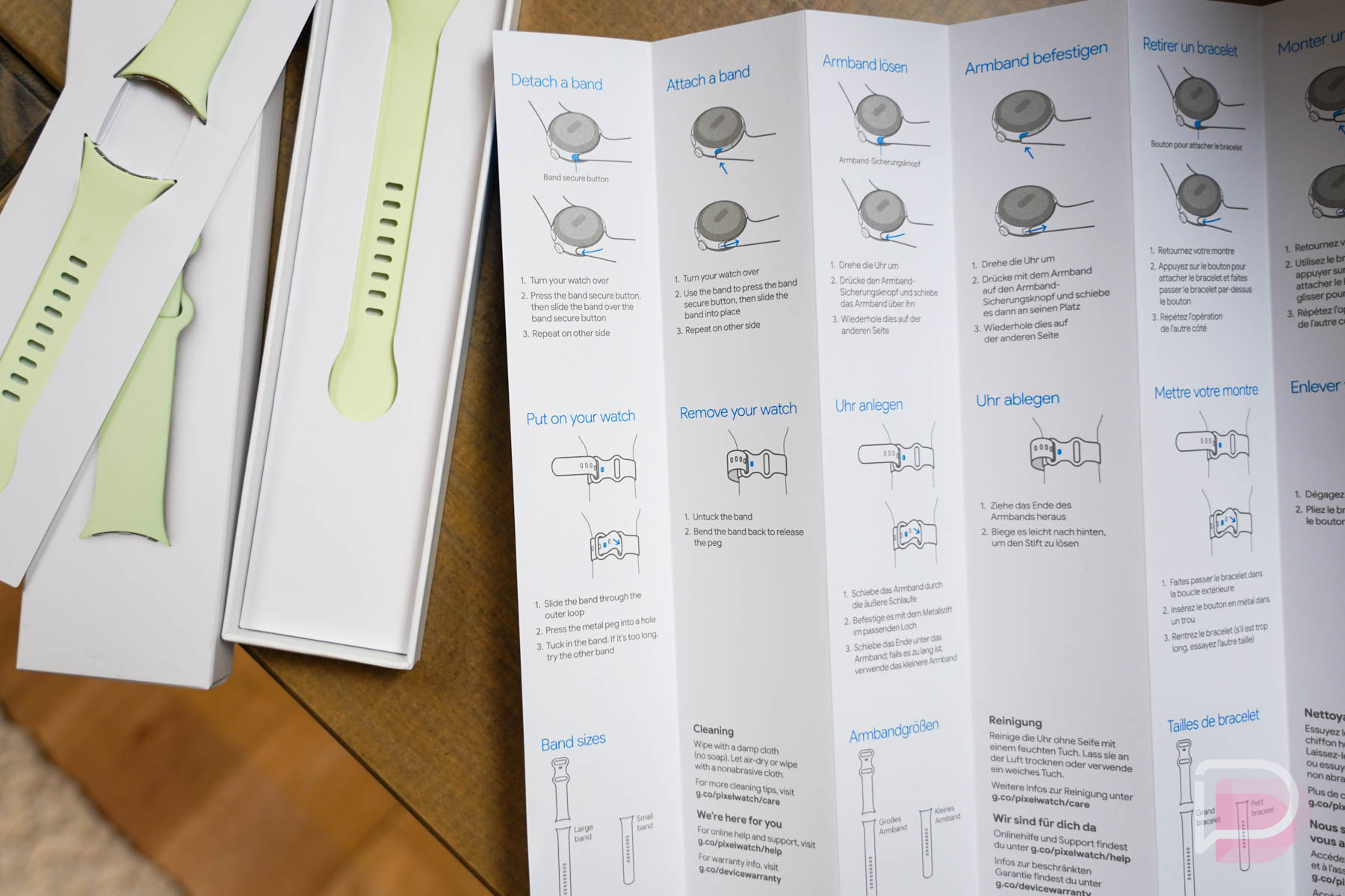 As for the rest of the details, we get to see the instructions for how to attach or detach Pixel Watch bands, as well as how to put the watch on. Google even offers up cleaning tips should you get busy in your Pixel Watch and need to wipe it down. The guide book lists out g.co/pixelwatch/care and g.co/pixelwatch/help as links you’ll visit in the future, both of which are currently not live.