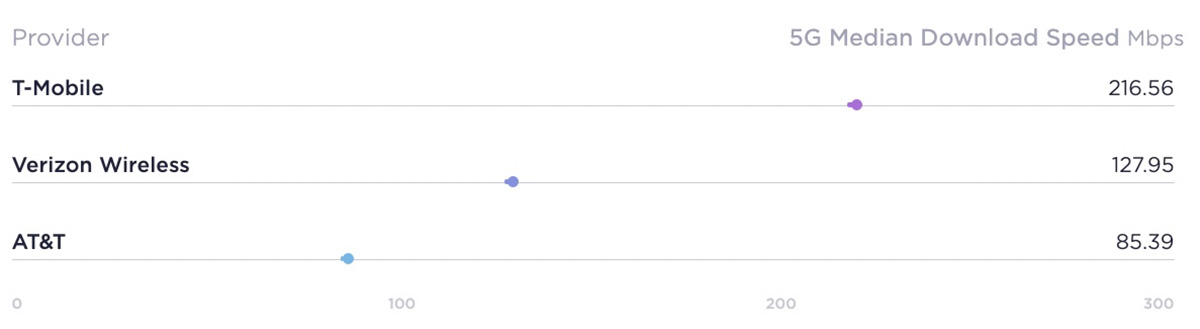 For 5G performance, T-Mobile posted a median download speed of 216Mbps, while Verizon and AT&T produced 127Mbps and 85Mbps speeds. Even for 5G availability, T-Mobile took the crown at 69%, with AT&T the closest at 64% and Verizon off in the corner at 34% (?!?).
